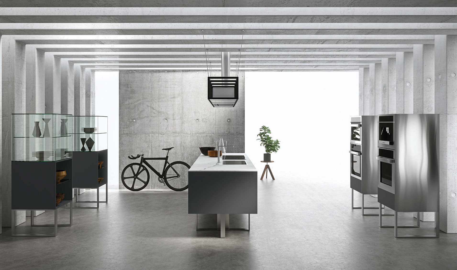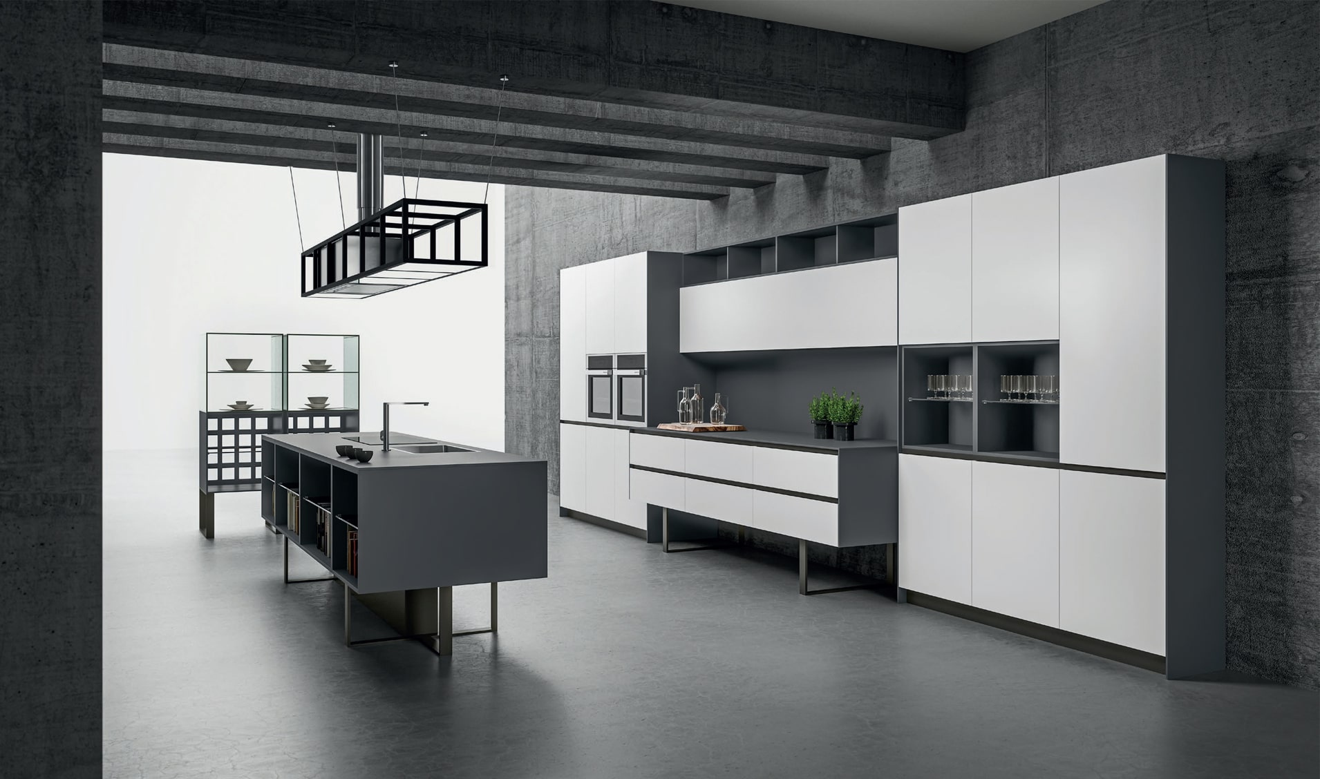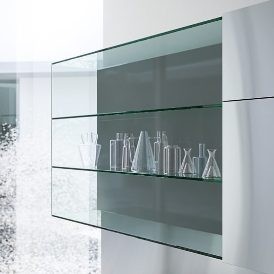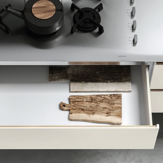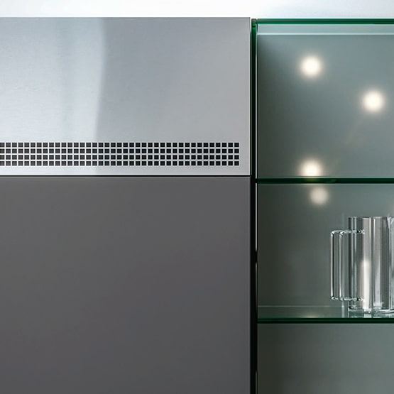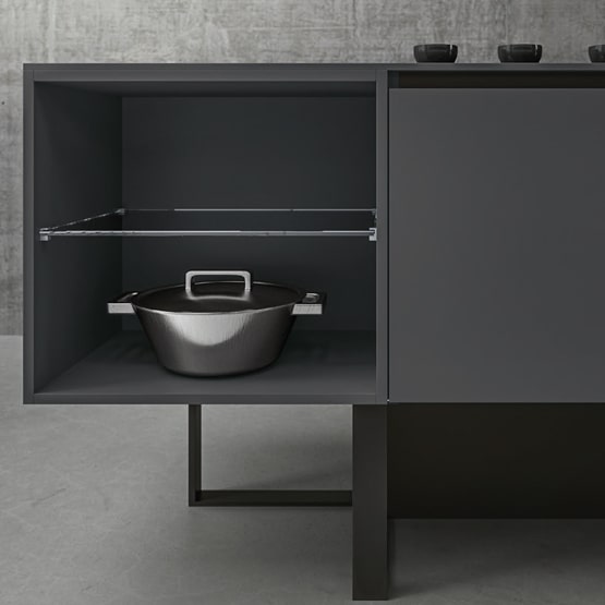 Sahne heybetli, kompakt, hazırlık ve pişirme için donatılmıştır. Perde, cam raflı ve entegre aydınlatmalı bir duvar dolabıdır.