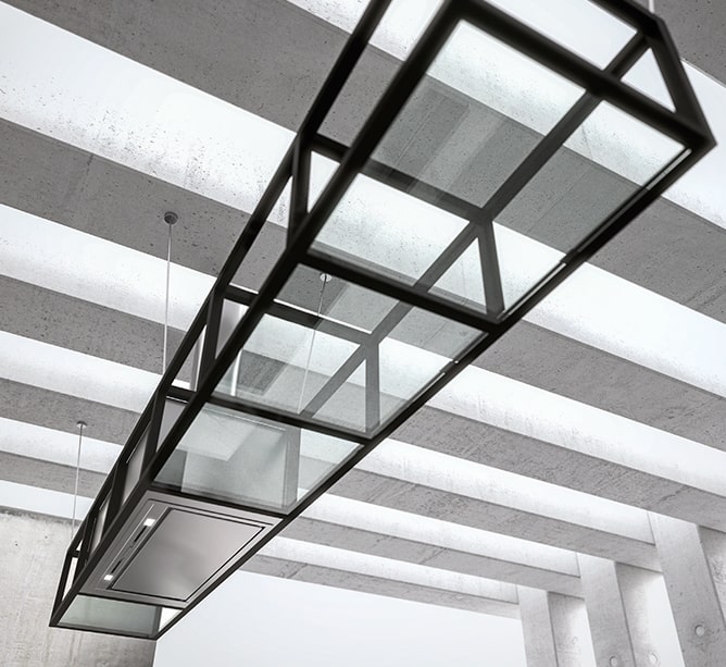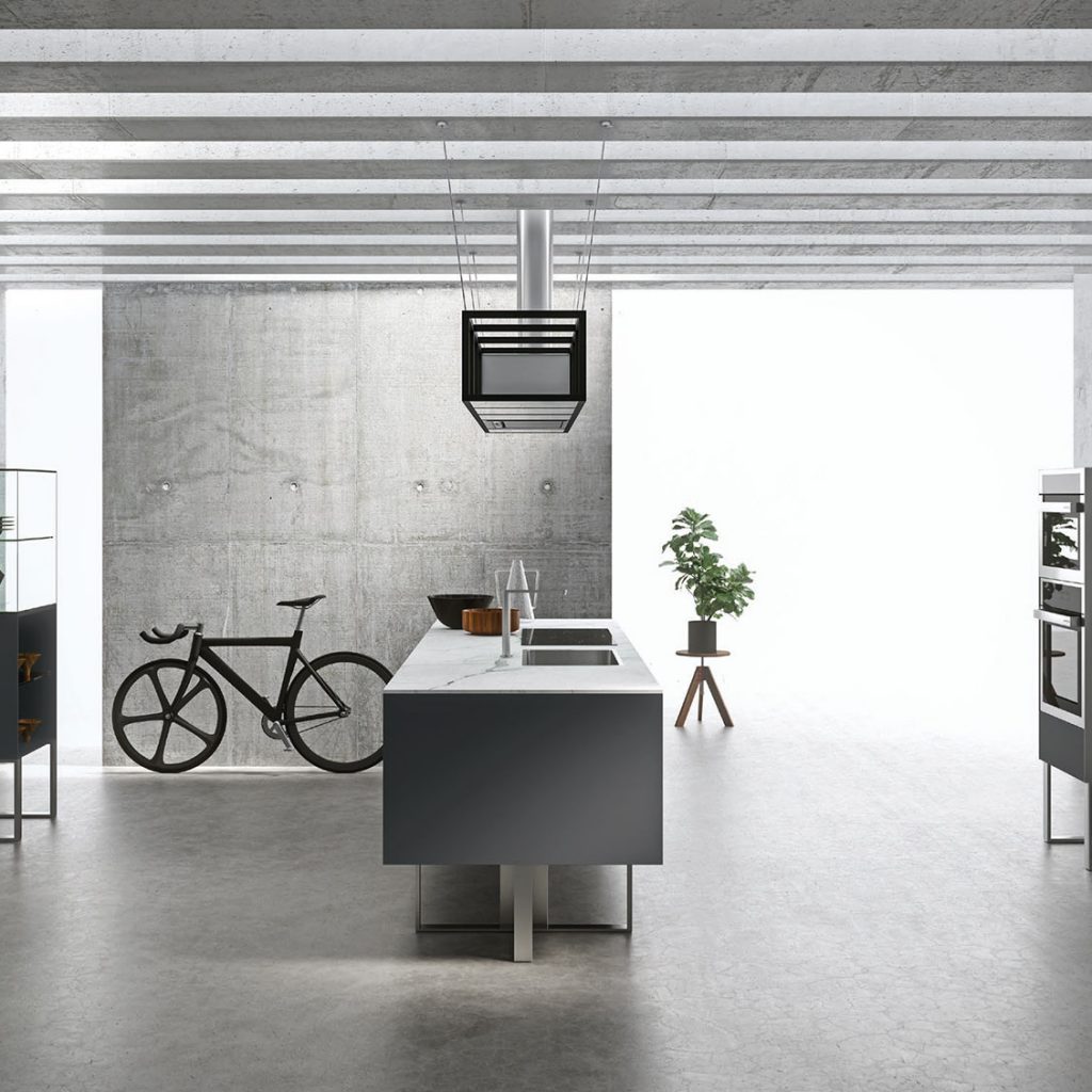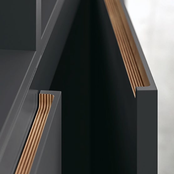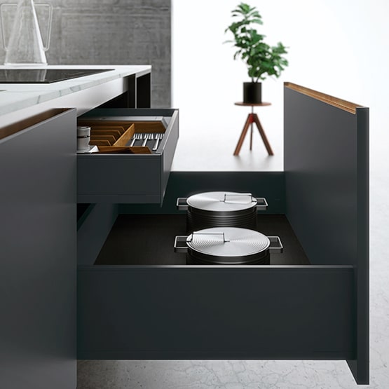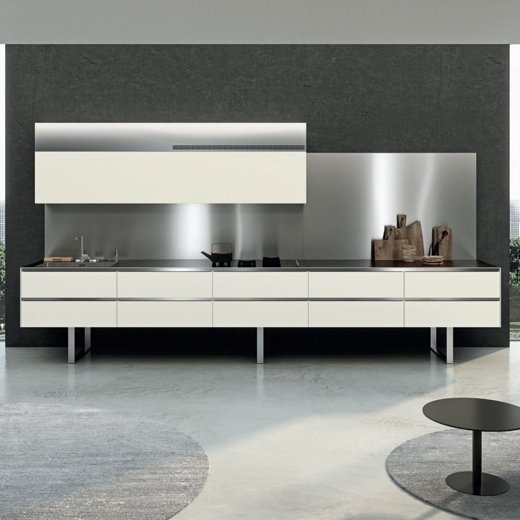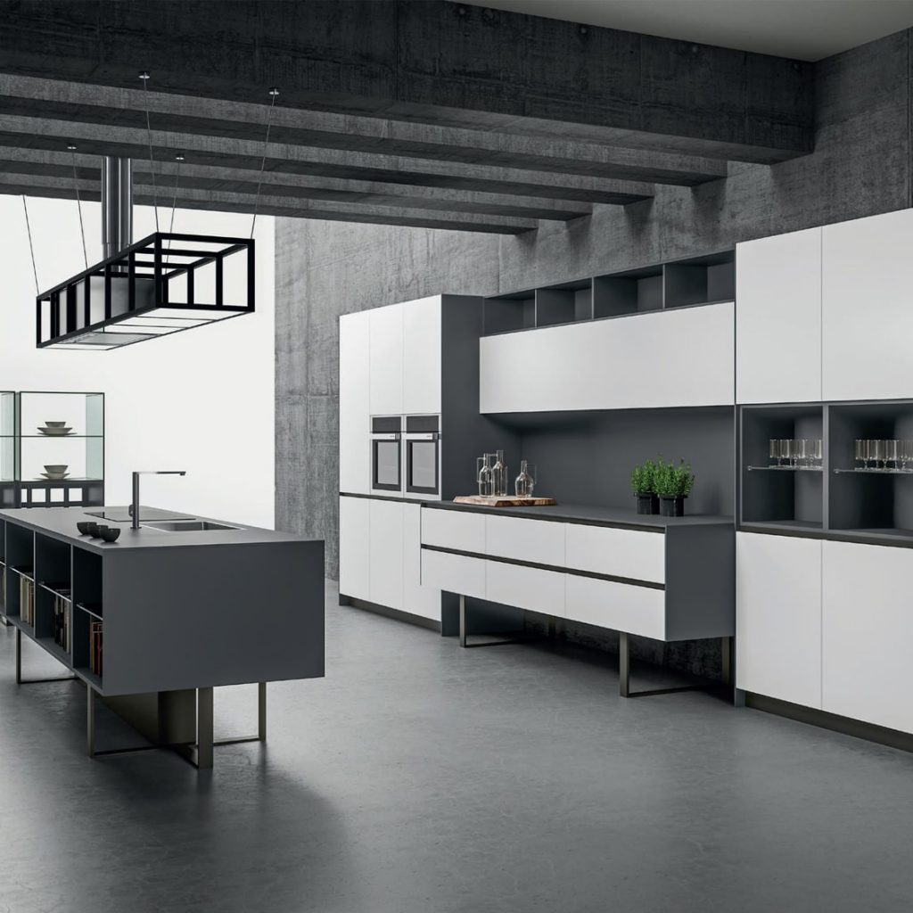 Sahne heybetli, kompakt, hazırlık ve pişirme için donatılmıştır. Perde, cam raflı ve entegre aydınlatmalı bir duvar dolabıdır.